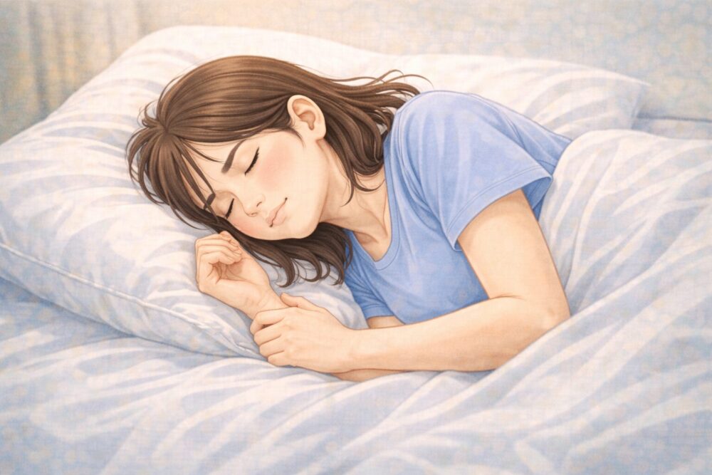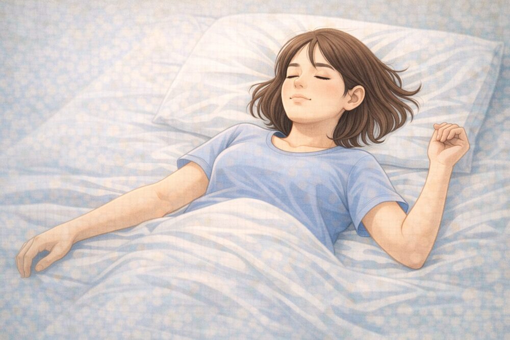 仰向けで寝る際は、首から背中にかけての自然なS字カーブを保つことが重要です。枕は首の隙間を埋め、頭が沈み込みすぎない高さのものを選びましょう。腕は体の横に自然に置くか、軽くお腹の上に置くと、肩への負担が少なくなります。膝を軽く立てて寝ると、腰への負担も軽減できます。