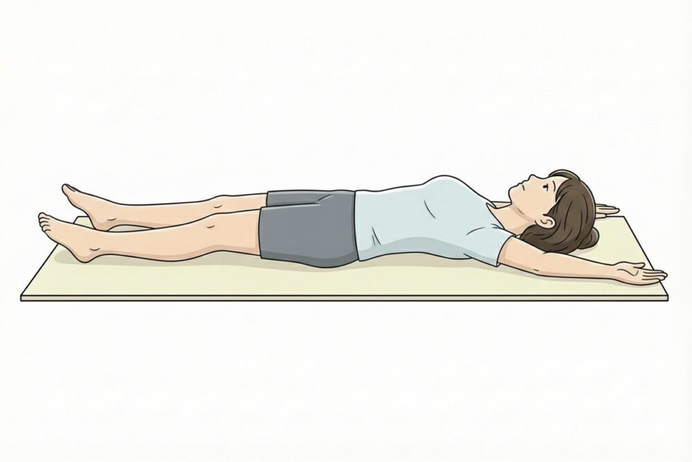 仰向けになり、両腕を広げて手のひらを上に向けて大きく開きます。胸の筋肉が伸びるのを感じながら、深呼吸を繰り返しましょう。猫背などで縮こまりがちな胸を開くことで、肩への負担も軽減されます。
