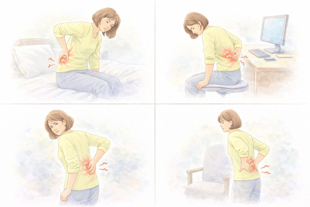| 鈍い痛み・重だるさ | 持続的、慢性化しやすい、動き始めに感じやすい | 筋肉の疲労、血行不良、姿勢の歪み、骨盤のアンバランス |