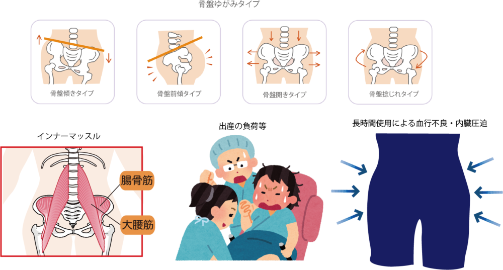 • 歪みの種類への対応:産後の骨盤の歪みは、単に「開く」だけでなく、ねじれや傾きなど複雑な状態を伴うことがあります。ガードルは外側から全体を締め付けるため、こうした複雑な歪みを個別に調整する機能は持ち合わせていません。