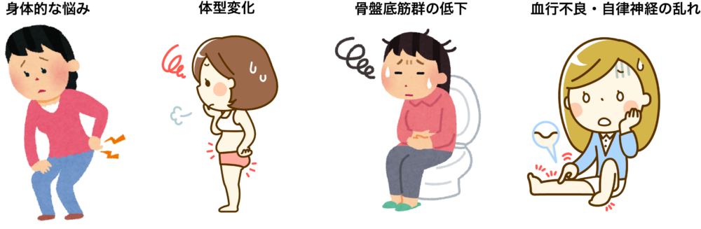 産後に骨盤が歪んだ状態が続くと、全身のバランスが崩れ、さまざまな体の不調やトラブルを引き起こす可能性があります。単に見た目の問題だけでなく、日々の生活の質にも大きく影響を及ぼすことがあります。