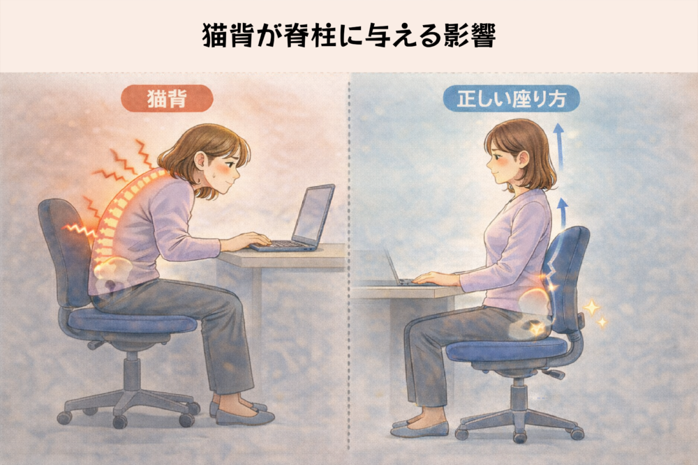 猫背とは、背中が丸まり、頭が前に突き出た姿勢のことです。この姿勢は、特に胸椎や腰椎の生理的弯曲が失われ、後弯が強調されることで発生します。猫背になると、本来であれば体重を分散するはずの脊柱のS字カーブが崩れ、腰椎の前方部分に大きな圧力がかかりやすくなります。