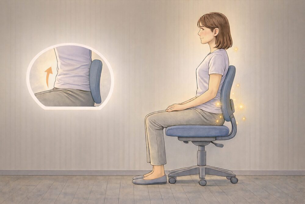 デスクワークや食事の際など、座る時間が長い方は特に注意が必要です。椅子に深く腰掛け、骨盤を立てることを意識してください。背もたれがある場合は、背中をしっかり預け、背骨の自然なカーブをサポートしましょう。