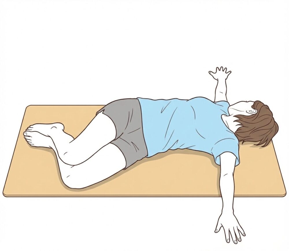 体幹ひねりストレッチ![]() | 仰向けになり、両膝を立てます。両腕を横に広げ、両膝をゆっくりと片側へ倒します。目線は膝と反対方向へ向け、20~30秒キープします。反対側も同様に行います。 | 肩が床から離れないように意識します。腰に痛みを感じる場合は無理せず、倒す角度を調整してください。 |
