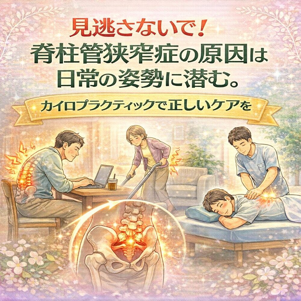 「脊柱管狭窄症の痛みやしびれに悩んでいませんか?その不調、実は日常の姿勢が大きな原因かもしれません。この記事では、脊柱管狭窄症がなぜ起こるのか、特に猫背や反り腰、長時間同じ姿勢といった日々の習慣がどのように脊柱に負担をかけ、症状を引き起こすのかを詳しく解説いたします。姿勢の歪みが脊柱管狭窄症の進行に深く関わっているため、正しい姿勢への意識とケアが非常に重要です。カイロプラクティックは、脊柱の歪みを整え、根本から姿勢を改善することで、脊柱管狭窄症の痛みを和らげ、快適な生活を取り戻すお手伝いをいたします。ご自身の姿勢を見直し、症状改善への一歩を踏み出すヒントをここで見つけてください。