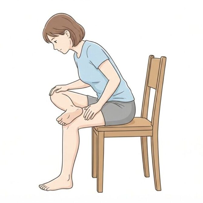 お尻のストレッチ![]() | 椅子に座り、片方の足をもう片方の膝の上に組みます。組んだ足の膝を軽く押し下げながら、上体をゆっくりと前に倒します。お尻の筋肉が伸びるのを感じながら、20~30秒キープします。反対側も同様に行います。 | お尻の深い部分の筋肉(梨状筋など)を伸ばすイメージです。痛みを感じる場合は無理せず、角度を調整してください。 |