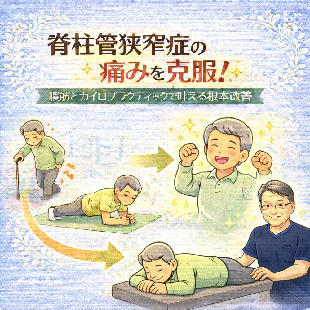 脊柱管狭窄症による腰や足の痛み、しびれ、歩行時のつらさに悩まされていませんか?「もうこの痛みとは一生の付き合いなのか」と諦めかけている方もいらっしゃるかもしれません。しかし、そのつらい症状を根本から見直すための道筋は存在します。この記事では、脊柱管狭窄症の症状を和らげ、日常生活をより快適に送るために、なぜ「腹筋」の強化が重要なのか、そして「カイロプラクティック」がどのように体のバランスを整え、神経機能にアプローチするのかを詳しく解説します。腹筋を鍛えることで脊柱を安定させ、カイロプラクティックで骨格の歪みを調整し神経の圧迫を和らげる。この二つのアプローチを組み合わせることで、脊柱管狭窄症の痛みを克服し、活動的な毎日を取り戻すための具体的な方法とヒントが得られるでしょう。諦める前に、ぜひこの新しい可能性を知り、ご自身の体と向き合うきっかけにしてください。