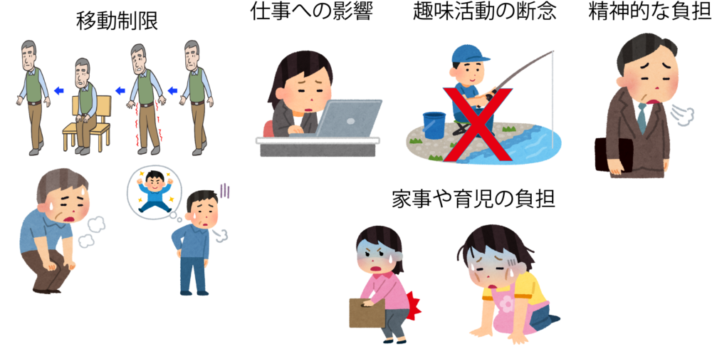 - 家事や育児の負担:腰をかがめる動作や、重いものを持つことがつらくなり、家事や育児に支障をきたすことがあります。