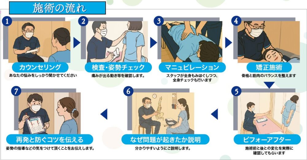 | アフターケア・アドバイス | 施術後の注意点や、日常生活で実践できる姿勢の改善方法、簡単なストレッチ、運動習慣などについて具体的なアドバイスを行います。 | 施術効果の持続と、症状の再発予防をサポートします。 |