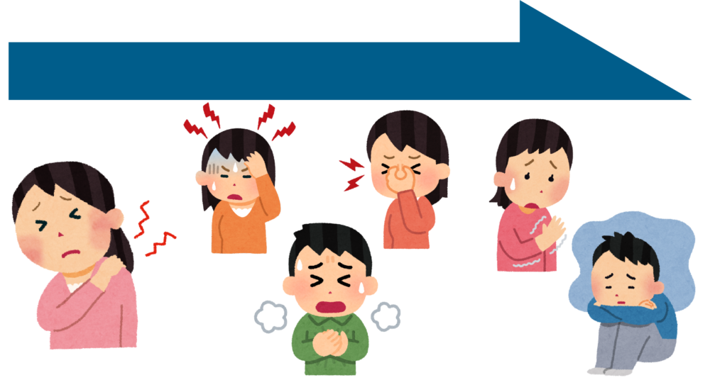 | 進行段階 | 慢性的な痛み、頭痛(緊張型頭痛)、めまい、吐き気、耳鳴り、眼精疲労 | 仕事や家事の効率低下、イライラ、睡眠の質の低下 |