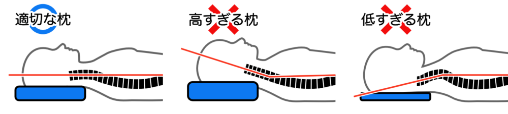 枕選びで最も大切なのは、適切な高さです。高すぎる枕は首が前に突き出た状態になり、低すぎる枕は首が反りすぎてしまいます。どちらも首の自然なS字カーブを崩し、首や肩の筋肉に余計な緊張を与え、結果として腰への負担につながることがあります。